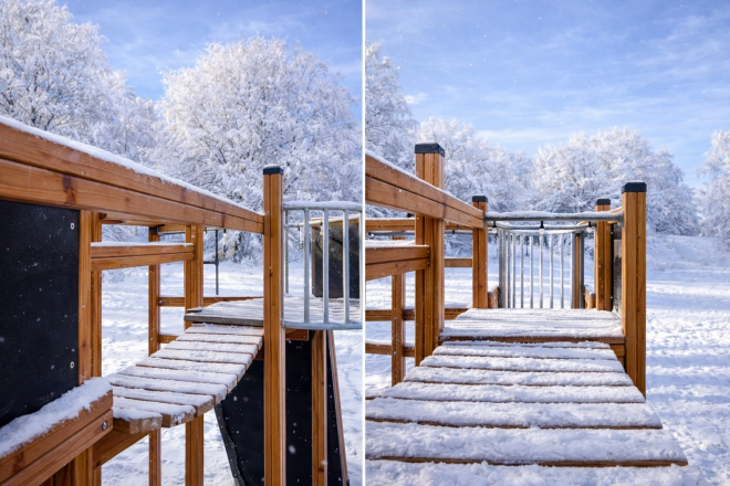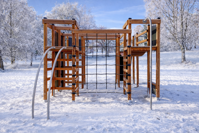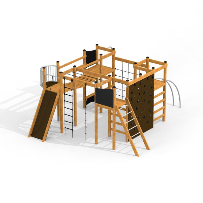 ผลิตจากไม้ Larch คุณภาพสูง ร่วมกับเหล็กกล้าไร้สนิมและเหล็กชุบสังกะสีที่ทนทานต่อสภาพอากาศ นอกจากนี้ยังใช้วัสดุรีไซเคิล HDPE และเชือก PP ที่เสริมความแข็งแรงทั้งแบบเส้นใยธรรมดาและแบบอ่อนนุ่ม พร้อมไม้อัดกันลื่นที่กันน้ำได้อย่างดี เพื่อความปลอดภัยและอายุการใช้งานที่ยาวนาน