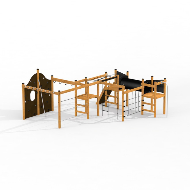 ผลิตจากไม้ลาร์ชคุณภาพสูงที่ทนทานต่อสภาพอากาศ พร้อมด้วยเหล็กกล้าไร้สนิมและเหล็กชุบสังกะสีที่เพิ่มความแข็งแรงและความมั่นคง โครงสร้างเสริมด้วยเชือก PP ที่แข็งแรงทั้งแบบเส้นหนาและนุ่ม รวมถึงแผ่นไม้อัดกันลื่นและกันน้ำที่ช่วยเพิ่มความปลอดภัยในขณะเล่น วัสดุอื่นๆ เช่น โพลีโพรพิลีน (PP) และโพลีเอทิลีน (PE) ที่ใช้เป็นส่วนประกอบเสริมเพื่อความทนทานและความปลอดภัย